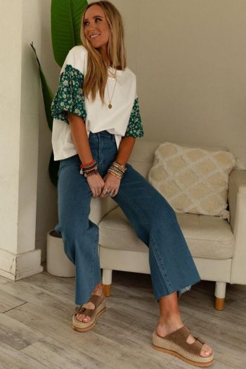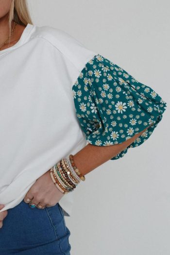 Women T Shirts | White Daisy Floral Patchwork Drop Sleeve Oversized Top