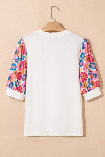 Women Blouses | Beige Floral Puff Sleeve Patchwork Round Neck Top