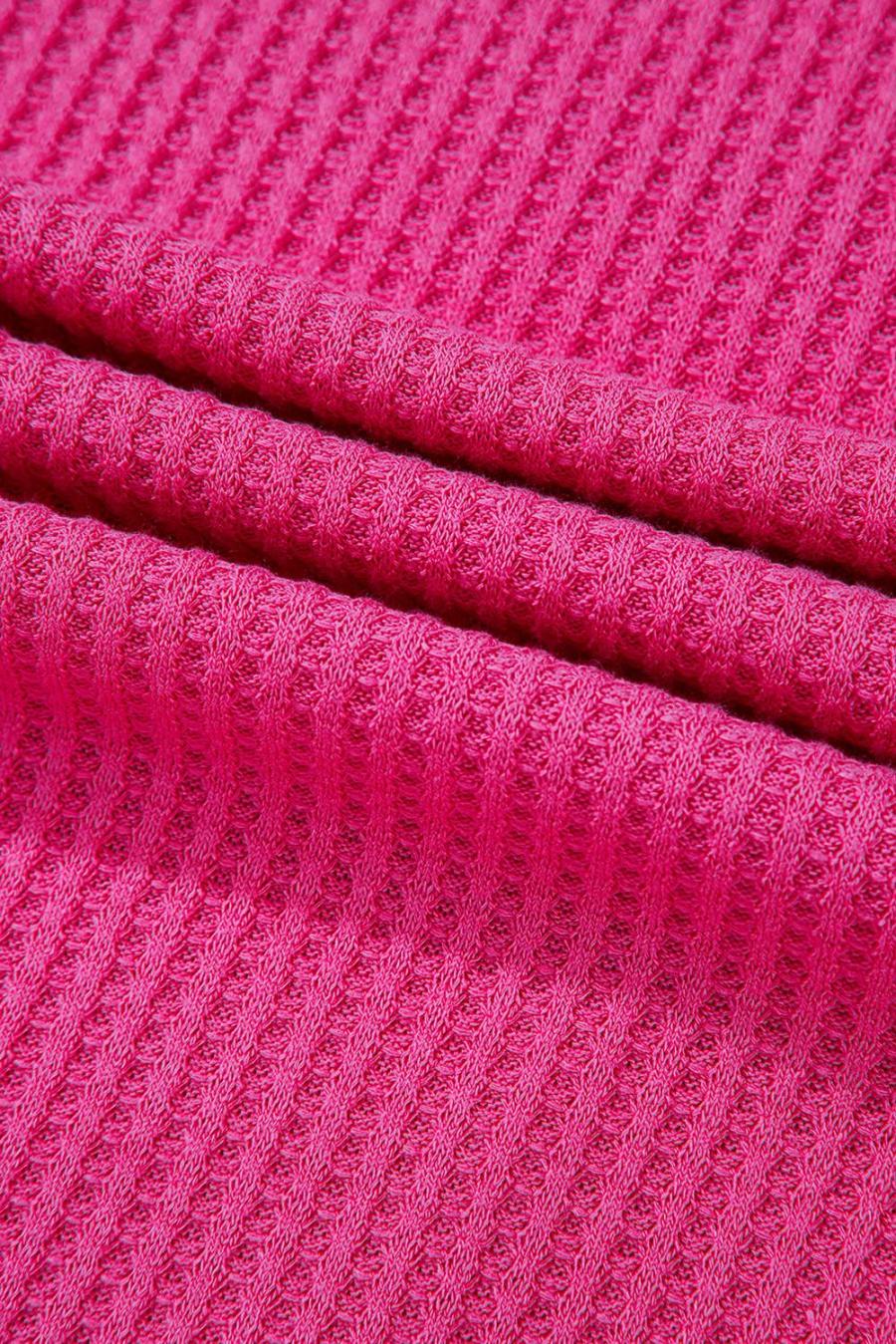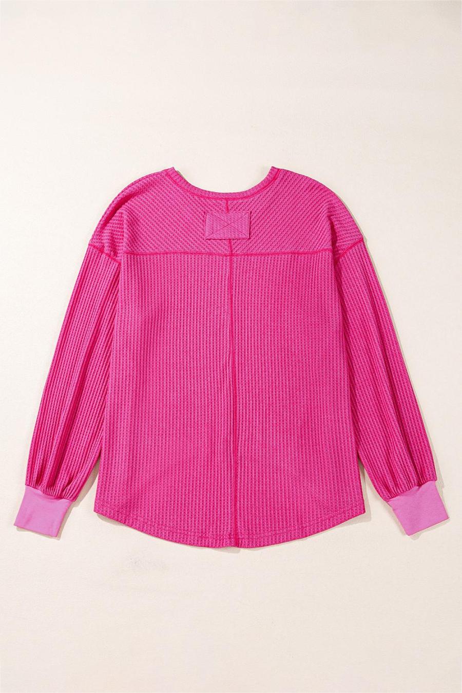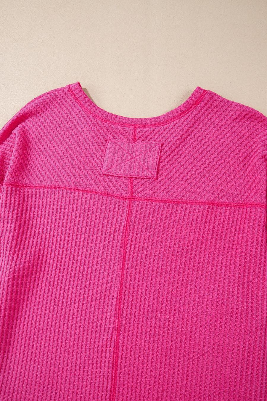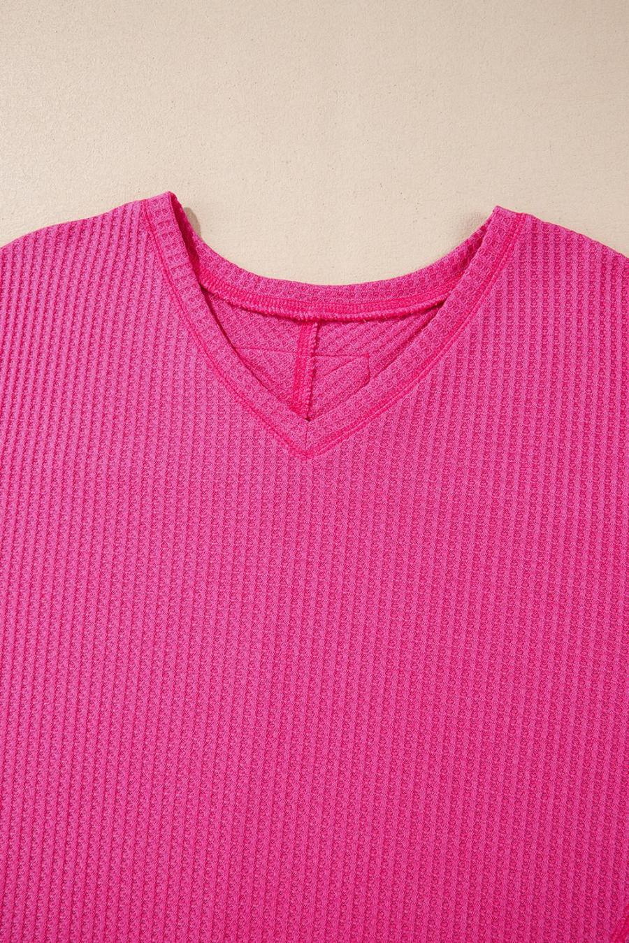 Women Knit Tops | Bright Pink Waffle V Neck Drop Shoulder Long Sleeve Loose Top