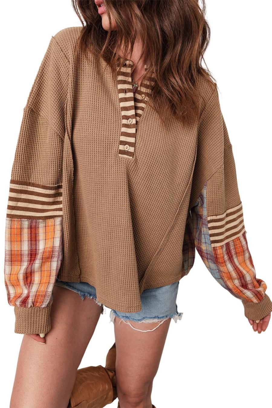Women Long Sleeve Tops | Straw Yellow Waffle Stripe Plaid Patchwork Henley Top