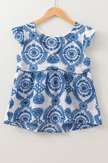 - Blue Boho Floral Sleeveless Blouse With Ruffle Detailing For A Whimsical Touch.