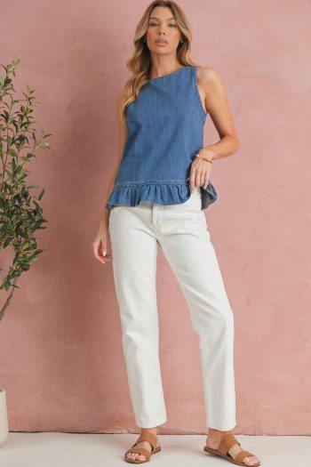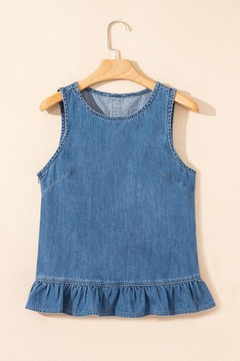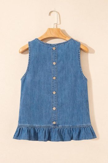 Women Sleeveless Tops | Sky Blue Ruffle Hem Button Back Sleeveless Denim Top