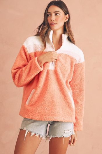 Women Sweatshirts & Hoodies | Orange Colorblock Zipper Stand Neck Sherpa Sweatshirt