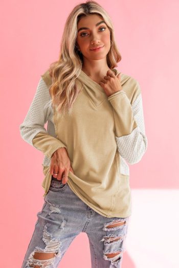 Women Sweatshirts & Hoodies | Parchment Textured Splicing Sleeve Raw Hem Hoodie